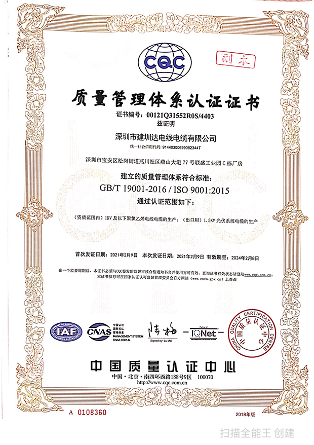 深圳建圳達電線電纜有限公司,成立于2000年,是一家電線電纜制造商,我們通過了世界各地不同市場的多數認證,如:CCC、RoHS、CB、SAA、TUV、VDE、PSE、BPS、UL、CSA。我們根據定制產品不斷更新新的認證。經過數十年的發展,我們與來自世界各地的客戶建立了長期的合作關系。我們曾經是菲律賓機場,,柬埔寨的電力站,美國的醫院,工廠,埃塞俄比亞的水電站項目。我們是一家值得信賴的電線供應商。